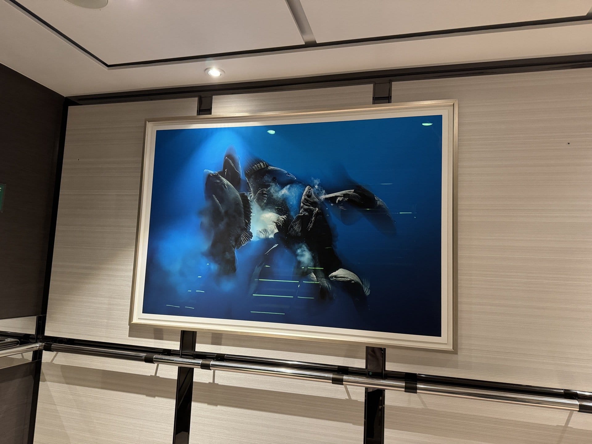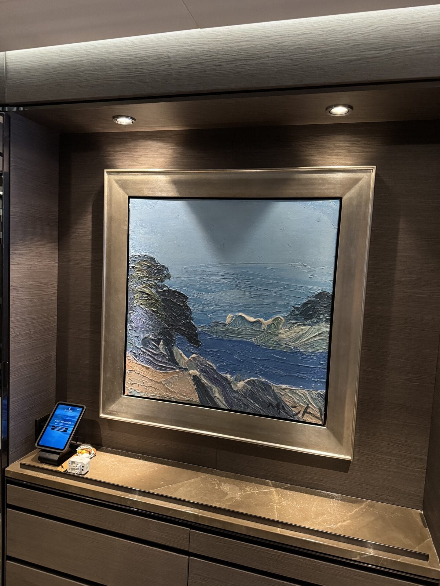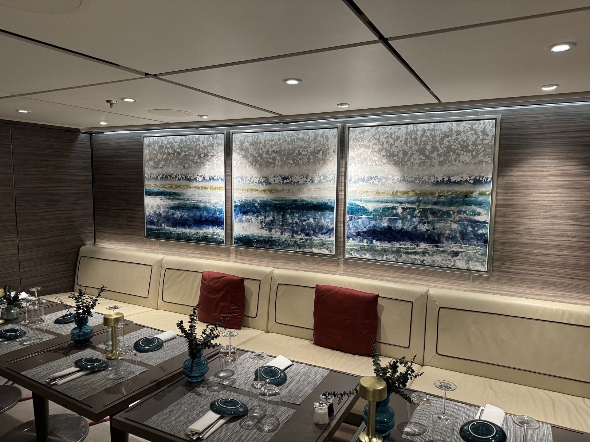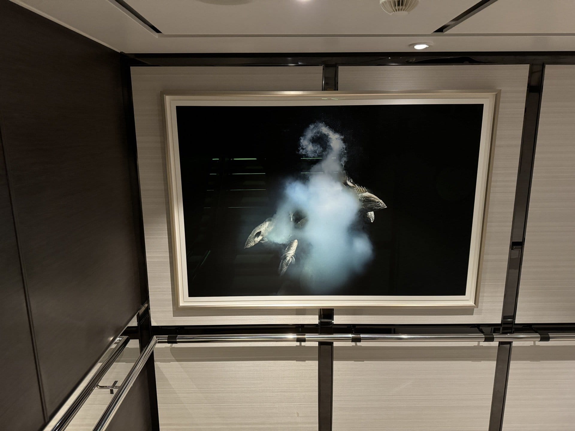 We were recently given the opportunity to frame art for all the rooms aboard a cruise ship on a Mediterranean trip. In our studio, we framed all the artworks that were delivered. Then we shipped everything to Nice, where it was loaded onto the cruise ship. At night during the cruise - the guests were not allowed to be disturbed - we hung the paintings in all the departures.